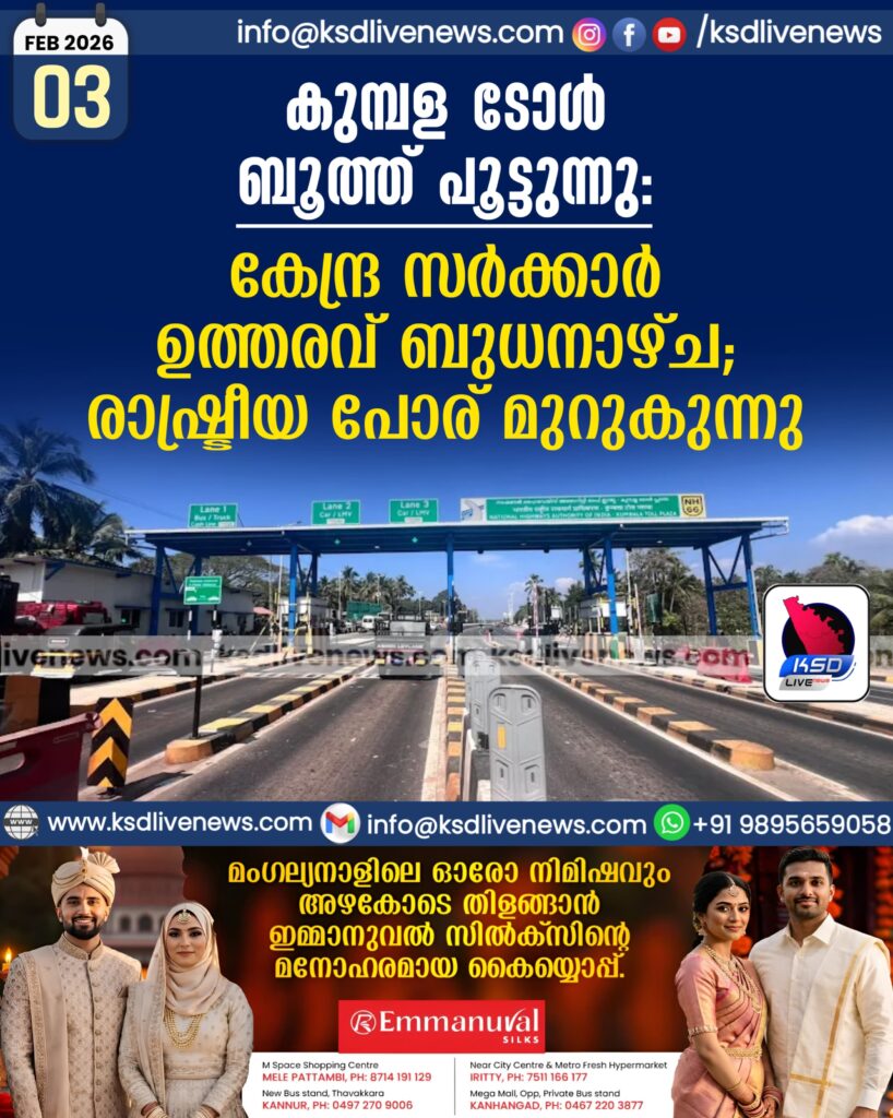 കുമ്പള ടോള്‍ ബൂത്ത് പൂട്ടുന്നു: കേന്ദ്ര സര്‍ക്കാര്‍ ഉത്തരവ് ബുധനാഴ്ച; രാഷ്ട്രീയ പോര് മുറുകുന്നു