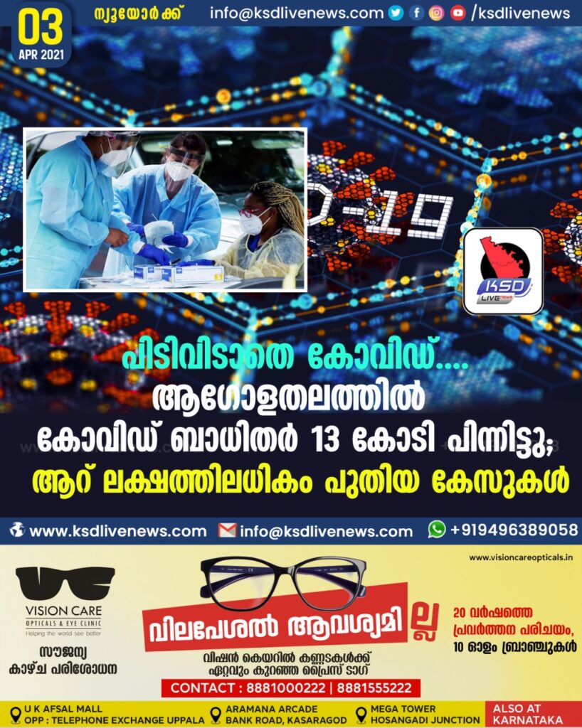 പിടിവിടാതെ കോവിഡ്…… ആഗോളതലത്തിൽ കോവിഡ് ബാധിതർ 13 കോടി പിന്നിട്ടു ; ആറ് ലക്ഷത്തിലധികം പുതിയ കേസുകൾ