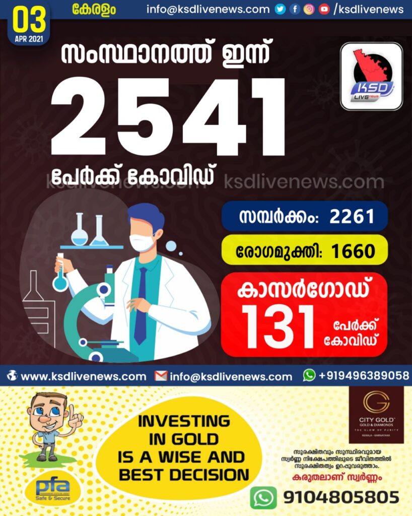 സംസ്ഥാനത്ത് ഇന്ന് 2541 പേർക്ക് കോവിഡ് സ്ഥിരീകരിച്ചു. സമ്പർക്കം വഴി 2261 പേർക്കും ; ആശ്വാസമായി 1660 പേർക്ക് രോഗ മുക്തിയും ; കാസർഗോഡ് ജില്ലയിൽ 131 പേർക്ക് പുതിയ കോവിഡ് കേസുകൾ ; മരണം 12