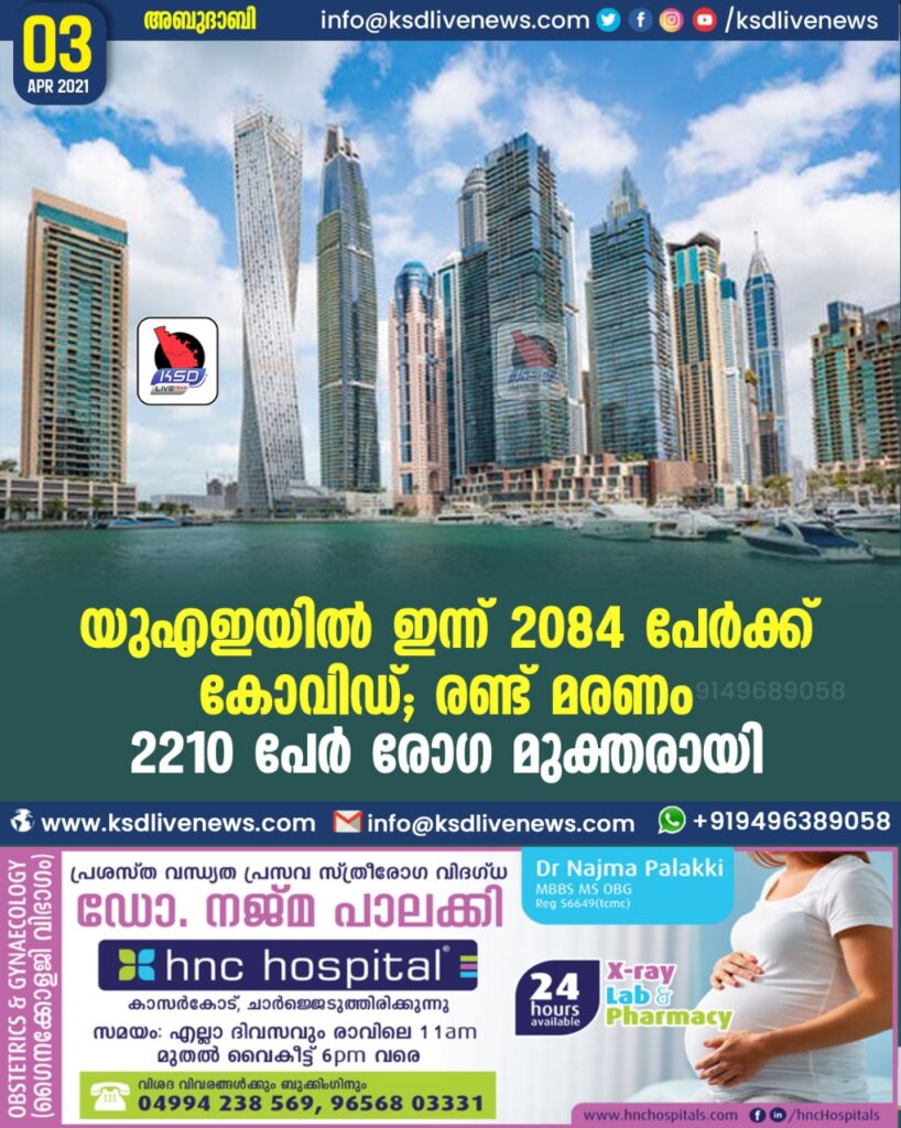യുഎഇയിൽ ഇന്ന് 2,084 പേർക്ക് കോവിഡ്, രണ്ട് മരണം; 2,210 പേർ രോഗ മുക്തരായി