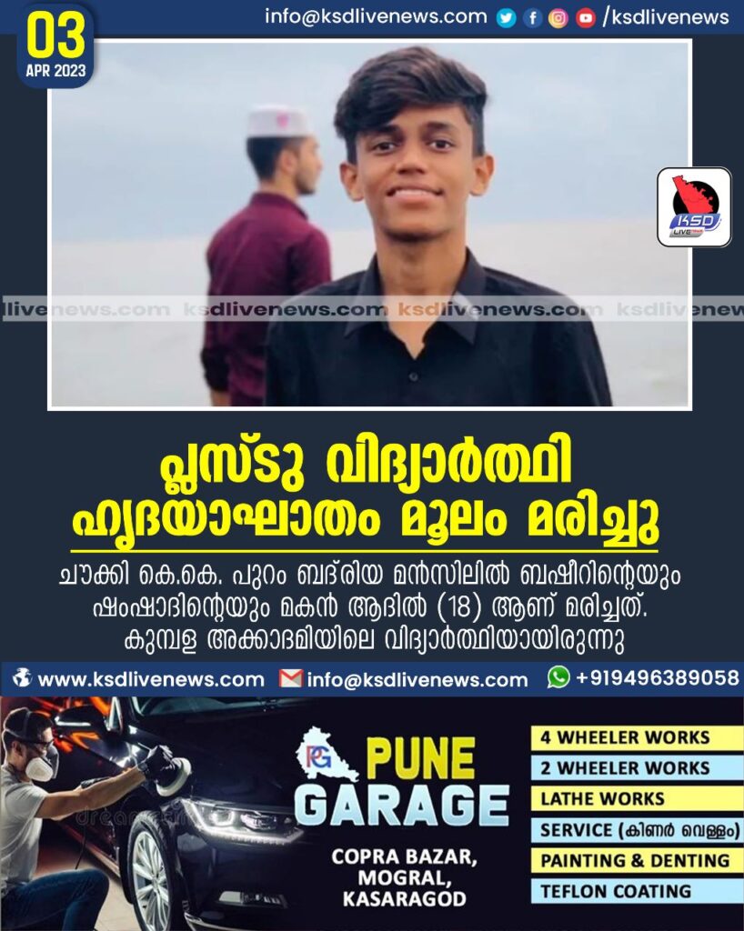 ചൗക്കി: പ്ലസ്ടു വിദ്യാര്ത്ഥി ഹൃദയാഘാതം മൂലം മരിച്ചു. ചൗക്കി കെ.കെ. പുറം ബദ്രിയ മന്സിലില് ബഷീറിന്റെയും ഷംഷാദിന്റെയും മകന് ആദില് (18) ആണ് മരിച്ചത്. കുമ്പള അക്കാദമിയിലെ വിദ്യാര്ത്ഥിയായിരുന്നു. അസുഖത്തെ തുടര്ന്ന് മംഗളൂരു ഫസ്റ്റ് ന്യൂറോ ആസ്പത്രിയില് ചികിത്സയിലായിരുന്നു. അതിനിടെയാണ് ഹൃദയാഘാതം അനുഭവപ്പെട്ട് മരണം സംഭവിച്ചത്. മയ്യത്ത് ചൗക്കി കടപ്പുറം ജുമാമസ്ജിദ് ഖബര് സ്ഥാനില് ഖബറടക്കും