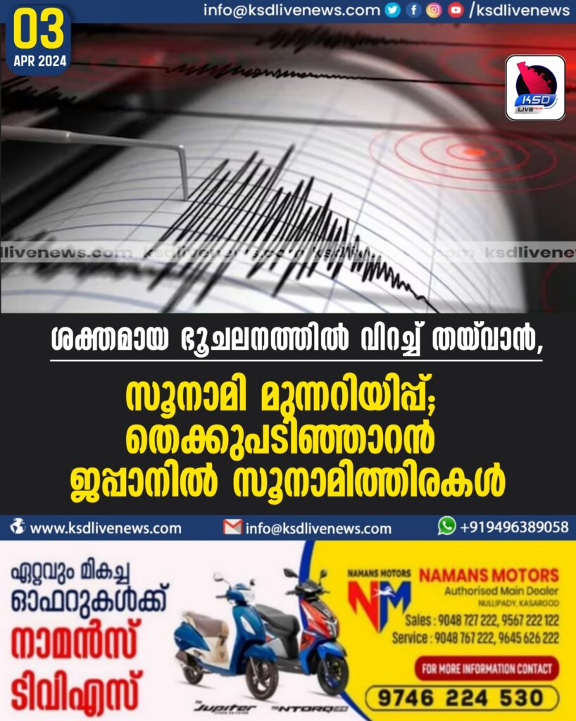 ശക്തമായ ഭൂചലനത്തിൽ വിറച്ച് തയ്‌വാൻ, സൂനാമി മുന്നറിയിപ്പ്; തെക്കുപടിഞ്ഞാറൻ ജപ്പാനിൽ സൂനാമിത്തിരകൾ