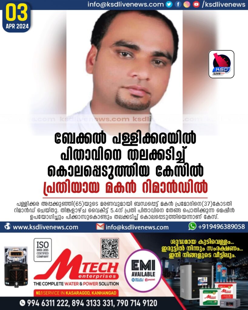 ബേക്കൽ പള്ളിക്കരയിൽ പിതാവിനെ തലക്കടിച്ച് കൊലപ്പെടുത്തിയ കേസിൽ പ്രതിയായ മകൻ റിമാൻഡിൽ