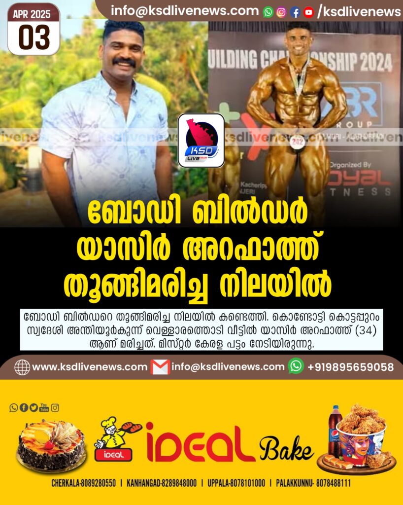 ബോഡി ബില്ഡര് യാസിര് അറഫാത്ത് തൂങ്ങിമരിച്ച നിലയില്