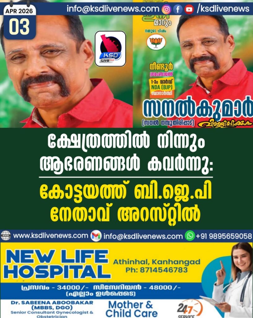 ക്ഷേത്രത്തിൽ നിന്നും ആഭരണങ്ങൾ കവർന്നു; കോട്ടയത്ത് ബിജെപി നേതാവ് അറസ്റ്റിൽ