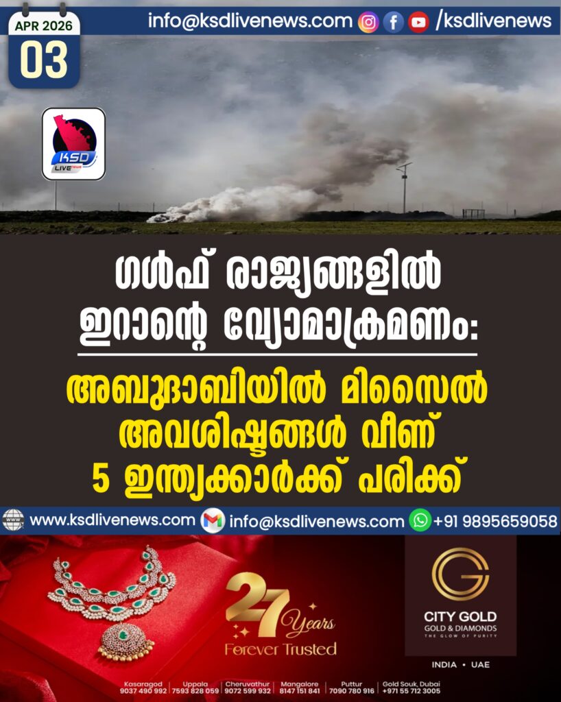 ഗൾഫ് രാജ്യങ്ങളിൽ ഇറാന്റെ വ്യോമാക്രമണം; അബുദാബിയിൽ മിസൈൽ അവശിഷ്ടങ്ങൾ വീണ് 5 ഇന്ത്യക്കാർക്ക് പരിക്ക്