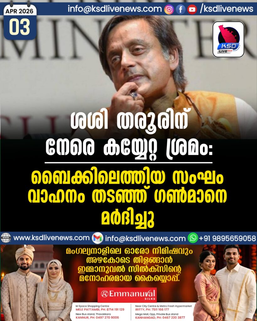 ശശി തരൂരിന് നേരെ കയ്യേറ്റ ശ്രമം; ബൈക്കിലെത്തിയ സംഘം വാഹനം തടഞ്ഞ് ഗൺമാനെ മർദിച്ചു