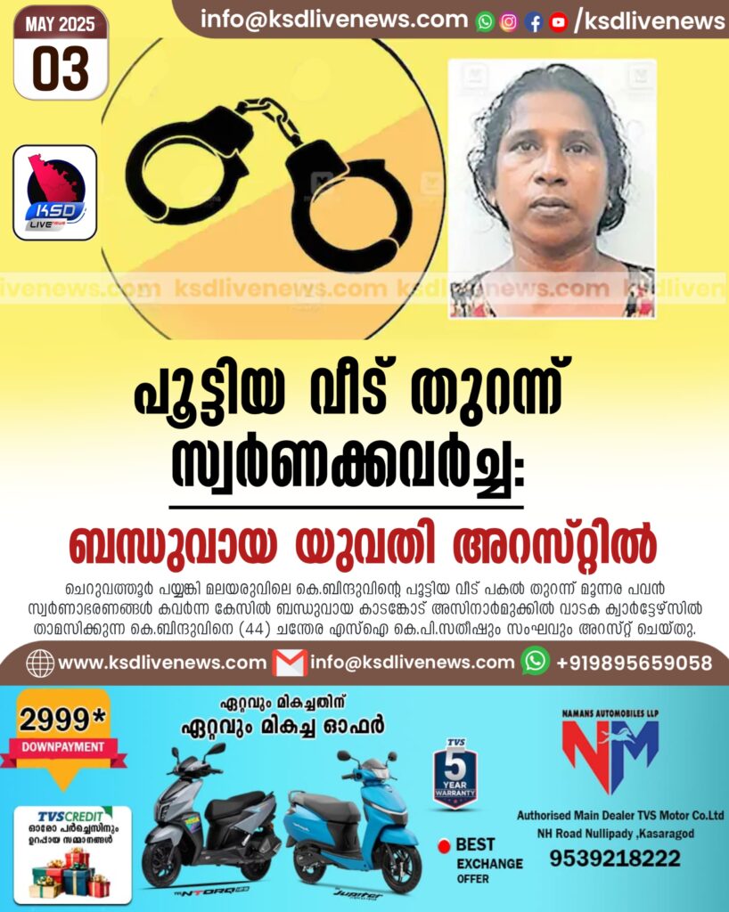 ചെറുവത്തൂർ: പയ്യങ്കി മലയരുവിലെ കെ.ബിന്ദുവിന്റെ പൂട്ടിയ വീട് പകൽ തുറന്ന് മൂന്നര പവൻ സ്വർണാഭരണങ്ങൾ കവർന്ന കേസിൽ ബന്ധുവായ കാടങ്കോട് അസിനാർമുക്കിൽ വാടക ക്വാർട്ടേഴ്സിൽ താമസിക്കുന്ന കെ.ബിന്ദുവിനെ (44) ചന്തേര എസ്ഐ കെ.പി.സതീഷും സംഘവും അറസ്റ്റ് ചെയ്തു. ബിന്ദു പിലിക്കോട് പ്രാദേശിക കാർഷിക ഗവേഷണ കേന്ദ്രത്തിലെ തൊഴിലാളിയാണ്. പയ്യങ്കൈ മലയരുവിലെ കെ.ബിന്ദുവിന്റെ വീട്ടിൽ ഏപ്രിൽ 27ന് ഞായറാഴ്ചയാണ് കവർച്ച നടന്നത്. ബിന്ദുവും കുടുംബവും ബന്ധുവിന്റെ മരണാനന്തര ചടങ്ങിന് കാഞ്ഞങ്ങാട് പോയി വൈകിട്ട് തിരിച്ചെത്തിയപ്പോൾ വീടിന്റെ മുൻ വാതിലിന്റെ ഒരു പാളി തുറന്നു കിടക്കുന്നതായി കണ്ടു.