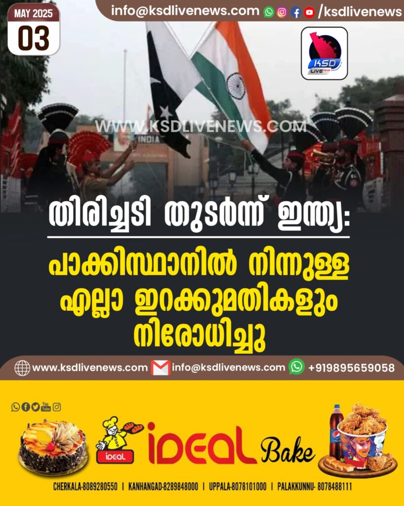 തിരിച്ചടി തുടര്ന്ന് ഇന്ത്യ; പാക്കിസ്ഥാനില് നിന്നുള്ള എല്ലാ ഇറക്കുമതികളും നിരോധിച്ചു