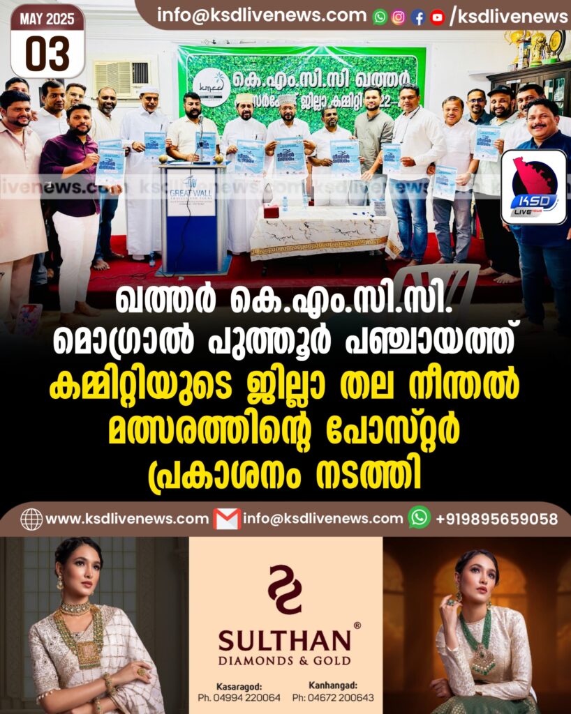ഖത്തർ കെഎംസിസി മൊഗ്രാൽ പുത്തൂർ പഞ്ചായത്ത് കമ്മിറ്റിയുടെ ജില്ലാ തല നീന്തൽ മത്സരത്തിന്റെ പോസ്റ്റർ പ്രകാശനം നടത്തി