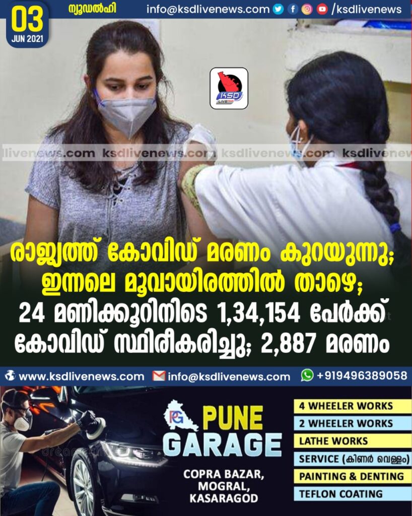 രാജ്യത്ത് കോവിഡ് മരണം കുറയുന്നു; ഇന്നലെ മൂവായിരത്തില്‍ താഴെ;  24 മണിക്കൂറിനിടെ 1,34,154 പേർക്ക് കോവിഡ് സ്ഥിരീകരിച്ചു ; 2,887 മരണം