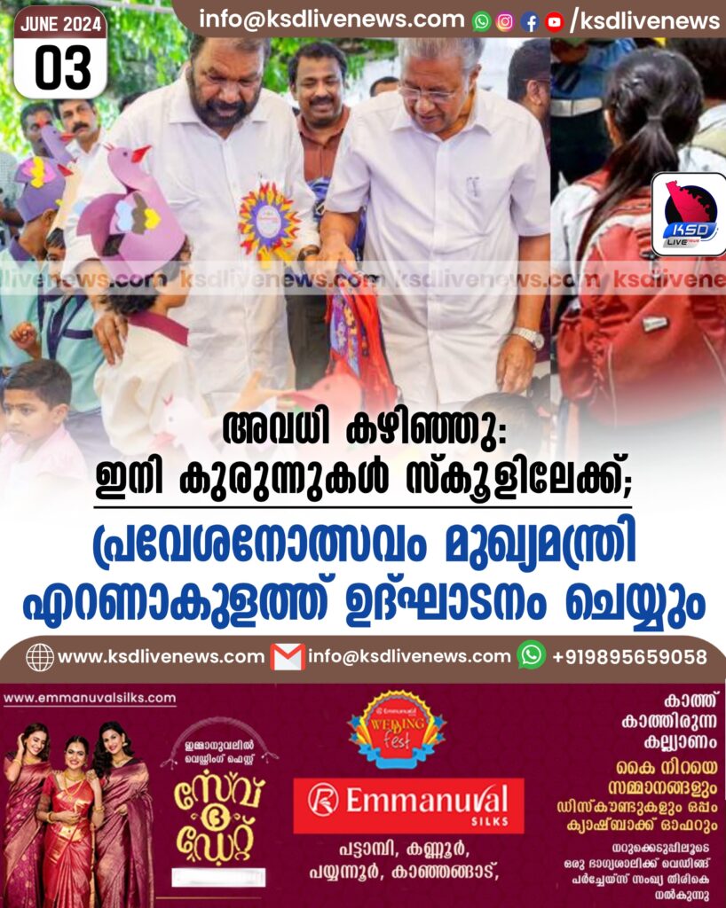 അവധി കഴിഞ്ഞു, ഇനി കുരുന്നുകള് സ്കൂളിലേക്ക്; പ്രവേശനോത്സവം മുഖ്യമന്ത്രി എറണാകുളത്ത് ഉദ്ഘാടനം ചെയ്യും