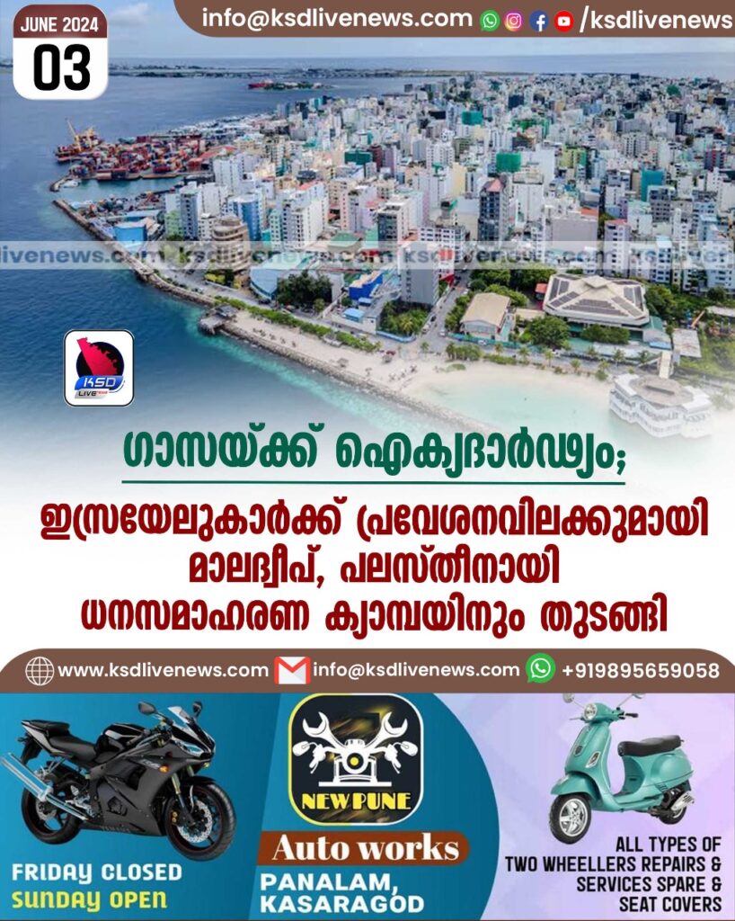ഇസ്രയേല് പാസ്പോർട്ടുള്ളവർക്ക് വിലക്ക് ഏർപ്പെടുത്താൻ പ്രസിഡന്റ് മുഹമ്മദ് മുയിസു തീരുമാനിച്ചെന്ന് അദ്ദേഹത്തിന്റെ ഓഫീസാണ് അറിയിച്ചത്. പുതിയ നിയമം എപ്പോള് പ്രാബല്യത്തില് വരുമെന്ന് വ്യക്തമാക്കിയിട്ടില്ല. പലസ്തീനായി ധനസമാഹരണ കാമ്ബെയ്നും മുയിസു പ്രഖ്യാപിച്ചു.