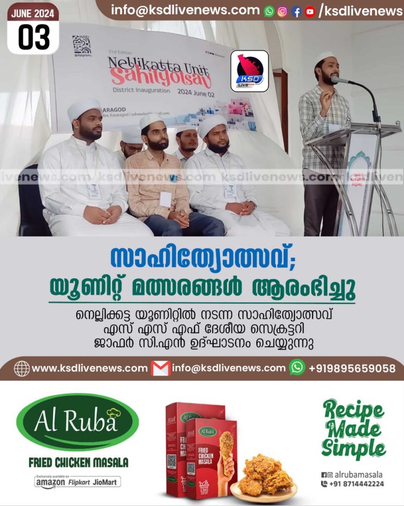 നെല്ലിക്കട്ട യൂണിറ്റിൽ നടന്ന സാഹിത്യോത്സവ് എസ് എസ് എഫ് ദേശീയ സെക്രട്ടറി ജാഫർ സി.എൻ ഉദ്ഘാടനം ചെയ്തു. ജില്ലാ സെക്രട്ടറി മൻഷാദ് അഹ്സനി അധ്യക്ഷത വഹിച്ചു. ജില്ലാ ജനറൽ സെക്രട്ടറി മുഹമ്മദ് നംഷാദ്, റിഷാദ് സഖാഫി സംസാരിച്ചു.