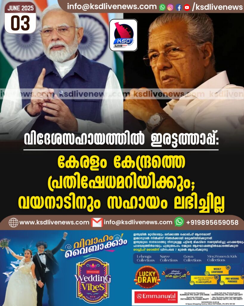 വിദേശസഹായത്തിൽ ഇരട്ടത്താപ്പ്: കേരളം കേന്ദ്രത്തെ പ്രതിഷേധമറിയിക്കും; വയനാടിനും സഹായം ലഭിച്ചില്ല