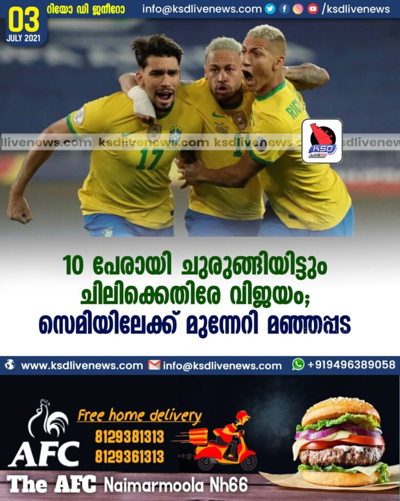 റിയോ ഡി ജനൈറോ: ചിലിയെ എതിരില്ലാത്ത ഒരു ഗോളിന് പരാജയപ്പെടുത്തി ബ്രസീൽ കോപ്പ അമേരിക്ക ടൂർണമെന്റിന്റെ സെമിയിൽ. 49-ാം മിനിറ്റിൽ ഗബ്രിയേൽ ജെസ്യൂസ് ചുവപ്പു കാർഡ് കണ്ട് പുറത്തുപോയിട്ടും ചിലി ഉയർത്തിയ വെല്ലുവിളി മറികടക്കാൻ ബ്രസീലിനായി. സെമിയിൽ പെറുവാണ് ബ്രസീലിന്റെ എതിരാളികൾ. ലുകാസ് പക്വേറ്റയാണ് മത്സരത്തിൽ പിറന്ന ഏക ഗോൾ നേടിയത്. മത്സരത്തിന്റെ തുടക്കത്തിൽ തന്നെ ബ്രസീൽ കളിയുടെ നിയന്ത്രണം ഏറ്റെടുത്തിരുന്നു. എന്നാൽ ആദ്യപകുതിയിലുടനീളം മികച്ച മുന്നേറ്റങ്ങൾ നടത്തിയെങ്കിലും ഗോൾ നേടാൻ ബ്രസീലിന് സാധിച്ചില്ല. 22-ാം മിനിറ്റിൽ നെയ്മറുടെ ക്രോസിൽ നിന്ന് ഗോൾ നേടാനുള്ള സുവർണാവസരം റോബർട്ടോ ഫിർമിനോ നഷ്ടപ്പെടുത്തി. പിന്നാലെ 27-ാം മിനിറ്റിൽ ചിലിക്കും അവസരം ലഭിച്ചു. മികച്ചൊരു മുന്നേറ്റത്തിനൊടുവിൽ എഡ്വാർഡോ വാർഗാസിന്റെ ഷോട്ട് ബ്രസീൽ ഗോൾകീപ്പർ എഡേഴ്സൺ മോറെസ് രക്ഷപ്പെടുത്തി. 37-ാം മിനിറ്റിൽ ഗബ്രിയേൽ ജെസ്യുസിന്റെ ക്രോസിൽ നിന്നുള്ള നെയ്മറുടെ ഷോട്ട് പുറത്തേക്ക് പോകുകയും ചെയ്തു. 43-ാം മിനിറ്റിൽ ഗബ്രിയേൽ ജെസ്യൂസിന്റെ ഷോട്ട് ചിലി ഗോൾകീപ്പർ ക്ലോഡിയോ ബ്രാവോ രക്ഷപ്പെടുത്തി. രണ്ടാം പകുതിയിൽ റോബർട്ടോ ഫിർമിനോയ്ക്ക് പകരം ലുകാസ് പക്വേറ്റയെ ഇറക്കിയ കോച്ച് ടിറ്റെയുടെ നീക്കം പെട്ടെന്നു തന്നെ ഫലം കണ്ടു. 47-ാം മിനിറ്റിൽ നെയ്മറുമൊന്നിച്ചുള്ള ഒരു മുന്നേറ്റത്തിനൊടുവിൽ പക്വേറ്റ പന്ത് വലയിലെത്തിച്ചു. പക്ഷേ ഗോളിന് തൊട്ടുപിന്നാലെ ഗബ്രിയേൽ ജെസ്യൂസ് ചുവപ്പു കാർഡ് കണ്ട് പുറത്തായത് ബ്രസീലിനെ പ്രതിരോധത്തിലാക്കി. യുജെനിയോ മെനയ്ക്ക് എതിരായ അപകടകരമായ ഫൗളിനെ തുടർന്നാണ് റഫറി ജെസ്യൂസിനെതിരേ നേരിട്ട് ചുവപ്പു കാർഡ് പുറത്തെടുത്തത്. 10 പേരായി ചുരുങ്ങിയ ബ്രസീൽ നിരയ്ക്കെതിരേ ചിലി പിന്നീട് ആക്രമണങ്ങൾ ശക്തമാക്കി. 69-ാം മിനിറ്റിൽ ബെൻ ബ്രെരട്ടന്റെ ഹെഡർ ക്രോസ്ബാറിലിടിച്ച് മടങ്ങിയത് ബ്രസീലിന് രക്ഷയായി. 78-ാം മിനിറ്റിൽ വാർഗാസിന്റെ ഗോളെന്നുറച്ച ഷോട്ട് രക്ഷപ്പെടുത്തി ഗോൾകീപ്പർ എഡേഴ്സൺ മോറെസും ടീമിനെ കാത്തു