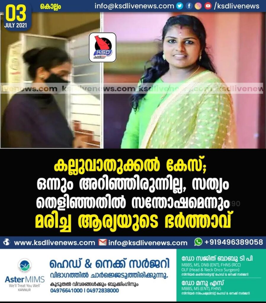 കല്ലുവാതുക്കൽ കേസ്; ഒന്നും അറിഞ്ഞിരുന്നില്ല, സത്യം തെളിഞ്ഞതിൽ സന്തോഷമെന്നും മരിച്ച ആര്യയുടെ ഭർത്താവ്