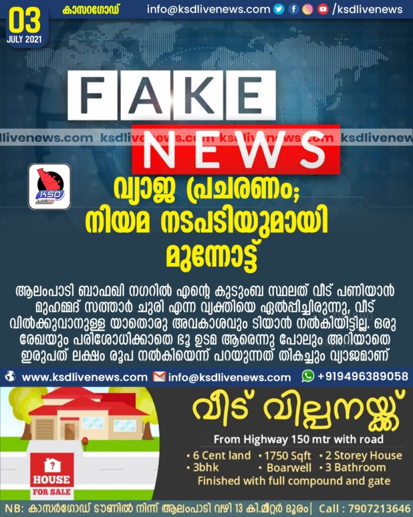 -കഴിഞ്ഞ മൂന്നു ദിവസമായി റിയൽ എസ്റ്റേറ്റിന്റെ പേരിൽ ഞാൻ പണം വാങ്ങിയതായും ഒരു കുടുംബത്തെ പറ്റിച്ചതായും നവ മാധ്യമങ്ങളിലൂടെയും ചില ഓൺലൈൻ ന്യൂസുകളിലൂടെയും കള്ളപ്രചരണം നടത്തിവരുന്നു . ആലംപാടി ബാഫഖി നഗറിൽ എന്റെ കുടുംബ സ്ഥലത് വീട് പണിയാൻ മുഹമ്മദ് സത്താർ ചുരി എന്ന വ്യക്തിയെ ഏൽപ്പിച്ചിരുന്നു .ലോക്ഡൗൺ കാരണം കുറച്ച് കാലത്തേക്ക് സ്ഥലം ( സന്ദർശിക്കുവാൻ സാധിച്ചിട്ടില്ല , ഇത് മുതലെടുത്തു വീട് പണിയാൻ ഏല്പിച്ച് വ്യക്തി സ്ഥല ഉടമ അറിയാതെ വേറെ ഒരു വ്യക്തിക്ക് ഇരുപത് ലക്ഷം രൂപ ഒരു രേഖയും ഇല്ലാതെ വാങ്ങിച്ച് വീട്ടിൽ അനധികൃതമായി താമസിപ്പിച്ചതായി അറിയാൻ സാധിച്ചു . വീട് വിൽക്കുവാനുള്ള യാതൊരു അവകാശവും ടിയാൻ നൽകിയിട്ടില്ല , ഒരു രേഖയും പരിശോധിക്കാതെ ഭൂ ഉടമ ആരെന്നു പോലും അറിയാതെ ഇരുപത് ലക്ഷം രൂപ നൽകിയെന്ന് പറയുന്നത് അവിശ്വസനീയമാണ് . ഇപ്പോൾ ഈ വീട് വാങ്ങിച്ച വ്യക്തിയും ഇടനിലക്കാരനുമായ മുഹമ്മദ് സത്താറും ഈ കച്ചവടം സംബന്ധിച്ച് ഒരു രൂപ പോലും കൈപറ്റാത്ത ഭൂ ഉടമയേയും കുടുംബത്തേയും അപമാനിച്ചു കൊണ്ടാണ് വ്യാജ പ്രചരണം നവ മാധ്യമങ്ങളിലൂടെ പ്രചരിപ്പിക്കുന്നത്. ഇവർക്കെതിരെ കർശന നിയമ നടപടികൾ സ്വീകരിക്കുന്നതാണ് . ഈ വ്യാജ നടപടിക്കെതിരെ ഭൂ ഉടമ ബഹുമാനപെട്ട സുപ്രിഡൻഡെന്റ് ഓഫ് പോലീസ് അവർകളുടെ മുമ്പാകെയും , കാസറഗോഡ് കോടതിയിലും കേസ് ഫയൽ ചെയ്തിട്ടുണ്ട് . ഒരു രേഖയും ഇല്ലാതെ ഇരുപത് ലക്ഷം രൂപ നൽകി കബളിക്കപ്പെട്ടു എന്ന് പറയുന്നത് നൂറു ശതമാനം സാക്ഷരതയുള്ള നമ്മുടെ നാട്ടിൽ വിശ്വസിക്കാവുന്നതിലും അപ്പുറത്താണ് . ഇരുപത് ലക്ഷം രൂപ കൊടുത്തു എന്ന് പറയുന്ന വ്യക്തി ഒരു രേഖയും ഇല്ല എന്ന് പ ന്നത് തന്നെ ഒരു കള്ളം മറച്ചു വെക്കാൻ വേണ്ടി നൂറു കള്ളം പറയുന്നതിന് സമാനമാണ് . അത് കൊണ്ട് ഭൂ ഉടമ ഇത് സംബന്ധിച് കോടതി മുഖേന നിയമ നടപടിയുമായി മുന്നോട്ട് പോകുന്നതാണ് .