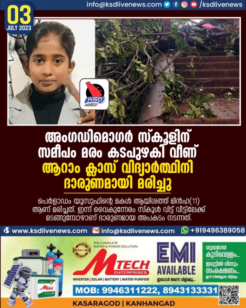അംഗഡിമൊഗർ സ്കൂളിന് സമീപം മരം കടപുഴകി വീണ് ആറാം ക്ലാസ് വിദ്യാർത്ഥിനി ദാരുണമായി മരിച്ചു.