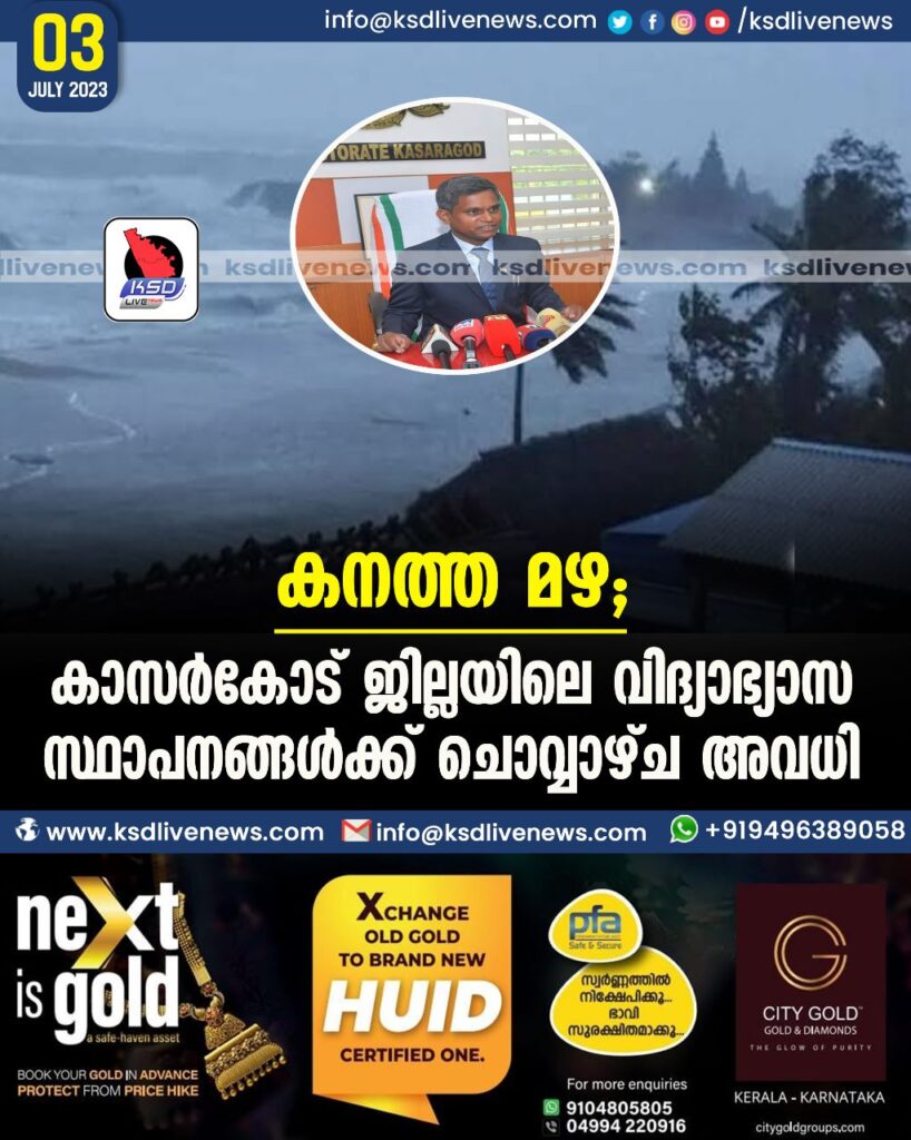 കാസകോട്: ജില്ലയിലെ മിക്ക പ്രദേശങ്ങളിലും കഴിഞ്ഞ 24 മണിക്കൂറിൽ അതിശക്തമായ മഴ രേഖപ്പെടുത്തിയിട്ടുണ്ട്. കാലവർഷക്കാറ്റ് ശക്തിപ്രാപിക്കുന്നതിനാൽ നാളെയും അതിശക്തമായ മഴയ്ക്കുള്ള ഓറഞ്ച് മുന്നറിയിപ്പ് കേന്ദ്ര കാലാവസ്ഥാ വകുപ്പ് ജില്ലയ്ക്ക് നൽകിയിട്ടുണ്ട്. ഈ സാഹചര്യത്തിൽ മുൻകരുതൽ എന്ന നിലയിൽ ജില്ലയിലെ സ്റ്റേറ്റ് , സിബിഎസ്ഇ, ഐസിഎസ് സി സ്കൂളുകൾ കേന്ദ്രീയ വിദ്യാലയങ്ങൾ, അങ്കണവാടികൾ, മദ്രസകൾ തുടങ്ങിയ വിദ്യാഭ്യാസ സ്ഥാപനങ്ങൾക്ക് ചൊവ്വാഴ്ച (ജൂലൈ 4, ) ജില്ലാ കളക്ടർ കെ. ഇമ്പ ശേഖർ അവധി പ്രഖ്യാപിച്ചു. അവധി മൂലം നഷ്ട്ടപ്പെടുന്ന പഠനസമയം ക്രമീകരിക്കാൻ വിദ്യാഭ്യാസ സ്ഥാപന മേധാവികൾ നടപടി സ്വീകരിക്കേണ്ടതാണ്. കൊളേജുകൾക്ക് നാളത്തെ അവധി ബാധകമല്ല.