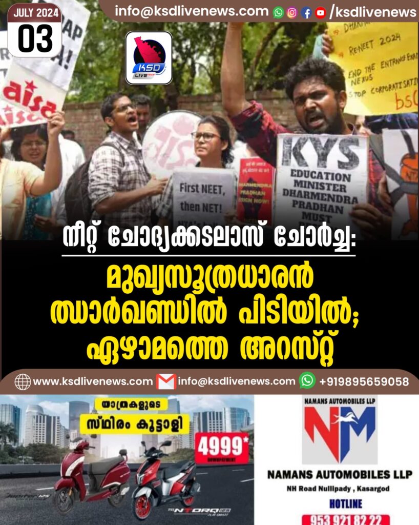 നീറ്റ് ചോദ്യക്കടലാസ് ചോർച്ച: മുഖ്യസൂത്രധാരൻ ഝാർഖണ്ഡിൽ പിടിയിൽ; ഏഴാമത്തെ അറസ്റ്റ്