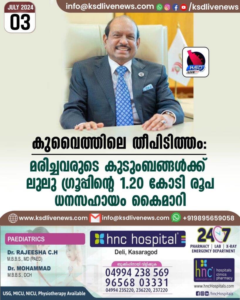 കുവൈത്ത് ദുരന്തത്തില്‍ മരിച്ച എല്ലാ ഇന്ത്യക്കാരുടെ കുടുംബാംഗങ്ങള്‍ക്കും എം.എ. യൂസഫലി ധനസഹായം പ്രഖ്യാപിച്ചിരുന്നു. മരിച്ചവരുടെ വിവരങ്ങള്‍ നോർക്ക ലഭ്യമാക്കുന്നതനുസരിച്ച് ബാക്കിയുള്ള തുകയും നോര്‍ക്കയ്ക്ക് ഉടൻ കൈമാറും.