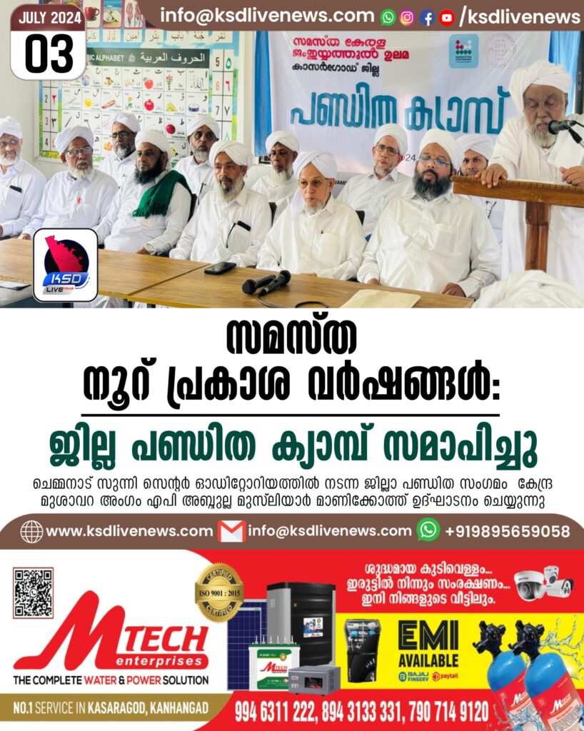 കാസർഗോഡ് : സമസ്ത നൂറാം വാർഷികാഘോഷത്തിന്റെ ഭാഗമായി ജില്ലാ ചെമനാട് സുന്നി മദ്രസ ഓഡിറ്റോറിയത്തിൽ സംഘടിപ്പിച്ച ജില്ലാ പണ്ഡിത ക്യാമ്പ് പ്രൗഢമായി സമാപിച്ചു. ജില്ലാ അംഗങ്ങൾക്ക് പുറമേ തെരഞ്ഞെടുക്കപ്പെട്ട 100 പണ്ഡിതന്മാർ പ്രതിനിധികൾ ആയിരുന്നു. പണ്ഡിത ദൗത്യവും നിർവഹണവും, സമസ്ത 100 പ്രകാശ വർഷങ്ങൾ എന്നീ സെഷനുകളിൽ വിഷയാവതരണവും ചർച്ചകളും നടന്നു.