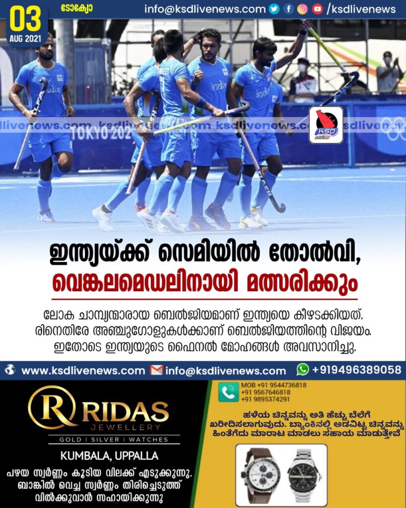 ടോക്യോ: ഒളിമ്പിക്സ് സെമി ഫൈനലിൽ ഇന്ത്യൻ പുരുഷ ഹോക്കി ടീമിന് തോൽവി. ലോക ചാമ്പ്യന്മാരായ ബെൽജിയമാണ് ഇന്ത്യയെ കീഴടക്കിയത്. രണ്ടിനെതിരേ അഞ്ചുഗോളുകൾക്കാണ് ബെൽജിയത്തിന്റെ വിജയം. ഇതോടെ ഇന്ത്യയുടെ ഫൈനൽ മോഹങ്ങൾ അവസാനിച്ചു. എന്നാൽ മെഡൽ പ്രതീക്ഷ അവസാനിച്ചിട്ടില്ല. വെങ്കല മെഡലിനായുള്ള മത്സരത്തിൽ ഇന്ത്യ, ഓസ്ട്രേലിയ-ജർമനി മത്സരത്തിൽ പരാജയപ്പെടുന്ന ടീമിനെ നേരിടും. ബെൽജിയത്തിനായി അലെക്സാണ്ടർ ഹെൻഡ്രിക്സ് ഹാട്രിക്ക് നേടിയപ്പോൾ നേടിയപ്പോൾ ഫാനി ലൂയ്പേർട്ടും ഡൊമിനിക് ഡോഹ്മെനും സ്കോർ ചെയ്തു. ഇന്ത്യയ്ക്ക് വേണ്ടി മൻപ്രീത് സിങ്ങും ഹർമൻ പ്രീത് സിങ്ങും ഗോൾ നേടി. 1980 ന് ശേഷം ഒളിമ്പിക്സ് ഫൈനലിന് യോഗ്യത നേടുക എന്ന ഉറച്ച ലക്ഷ്യവുമായി ഇറങ്ങിയ ഇന്ത്യൻ ടീം മികച്ച പ്രകടനമാണ് പുറത്തെടുത്തത്. ഒരു ഗോൾ വഴങ്ങിയ ശേഷം രണ്ട് ഗോളുകൾ തിരിച്ചടിച്ച് വിജയപ്രതീക്ഷയും നിലനിർത്തി. എന്നാൽ തകർപ്പൻ തിരിച്ചുവരവ് നടത്തിയ ബെൽജിയം മത്സരം ഇന്ത്യയിൽ നിന്നും തട്ടിയെടുക്കുകയായിരുന്നു. ഇന്ത്യയെ ഞെട്ടിച്ചുകൊണ്ട് ബെൽജിയമാണ് മത്സരത്തിലാദ്യം ലീഡെടുത്തത്. മത്സരം തുടങ്ങി രണ്ടാം മിനിട്ടിൽ തന്നെ ബെൽജിയം ഇന്ത്യയ്ക്കെതിരേ ലീഡെടുത്തു. പെനാൽട്ടി കോർണറിൽ നിന്നാണ് ഗോൾ പിറന്നത്. ഫാനി ലൂയ്പേർട്ടാണ് ബെൽജിയത്തിനായി ഗോൾ നേടിയത്. ഗോൾ വഴങ്ങിയതോടെ ഉണർന്നു കളിച്ച ഇന്ത്യ 11-ാം മിനിട്ടിൽ തന്നെ തിരിച്ചടിച്ച് സമനില ഗോൾ നേടി. പെനാൽട്ടി കോർണറിലൂടെ ഹർമൻപ്രീത് സിങ്ങാണ് ബെൽജിയം വല കുലുക്കിയത്. താരത്തിന്റെ ഒളിമ്പിക്സിലെ അഞ്ചാം ഗോളാണിത്. സമനില ഗോൾ നേടിയതിന് തൊട്ടുപിന്നാലെ ലോകചാമ്പ്യന്മാരായ ബെൽജിയത്തെ ഞെട്ടിച്ചുകൊണ്ട് ഇന്ത്യ രണ്ടാം ഗോൾ നേടി ലീഡെടുത്തു. ഇത്തവണ മൻദീപ് സിങ്ങാണ് ഇന്ത്യയ്ക്ക് വേണ്ടി ഗോൾ നേടിയത്. തകർപ്പൻ ഷോട്ടിലൂടെയാണ് താരം ഇന്ത്യയ്ക്ക് ലീഡ് സമ്മാനിച്ചത്. മൻദീപ് ഒളിമ്പിക്സിൽ നേടുന്ന ആദ്യ ഗോളാണിത്. അതുമാത്രമല്ല ഇന്ത്യയ്ക്ക് വേണ്ടി ടോക്യോ ഒളിമ്പിക്സിൽ ഗോൾ നേടുന്ന 12-ാമത്തെ താരം കൂടിയായി മൻദീപ്. ഗോൾ വഴങ്ങിയതോടെ ബെൽജിയം ആക്രമണം ശക്തമാക്കിയെങ്കിലും ഇന്ത്യയുടെ പ്രതിഭാസമ്പന്നരായ പ്രതിരോധനിര അവയെയെല്ലാം നിഷ്പ്രഭമാക്കി. ലീഡ് നേടിയിട്ടും ആക്രമിച്ച് കളിക്കാനാണ് ഇന്ത്യ തീരുമാനിച്ചത്. ആദ്യ ക്വാർട്ടറിൽ 2-1 എന്ന സ്കോറിന് ഇന്ത്യ മുന്നിലെത്തി. രണ്ടാം ക്വാർട്ടറിന്റെ തുടക്കത്തിൽ തന്നെ ബെൽജിയം സമനില ഗോൾ കണ്ടെത്തി. 19-ാം മിനിട്ടിൽ ബെൽജിയത്തിന്റെ ഗോളടിയന്ത്രം അലെക്സാണ്ടർ ഹെൻഡ്രിക്സാണ് ഗോൾ നേടിയത്. ഇതോടെ സ്കോർ 2-2 എന്ന നിലയിലായി. ടൂർണമെന്റിലെ ടോപ് സ്കോററായ ഹെൻഡ്രിക്സിന്റെ ടൂർണമെന്റിലെ 12-ാം ഗോളാണിത്. രണ്ടാം ക്വാർട്ടറിൽ ബെൽജിയമാണ് കൂടുതൽ ആധിപത്യം പുലർത്തിയത്. ഗോളെന