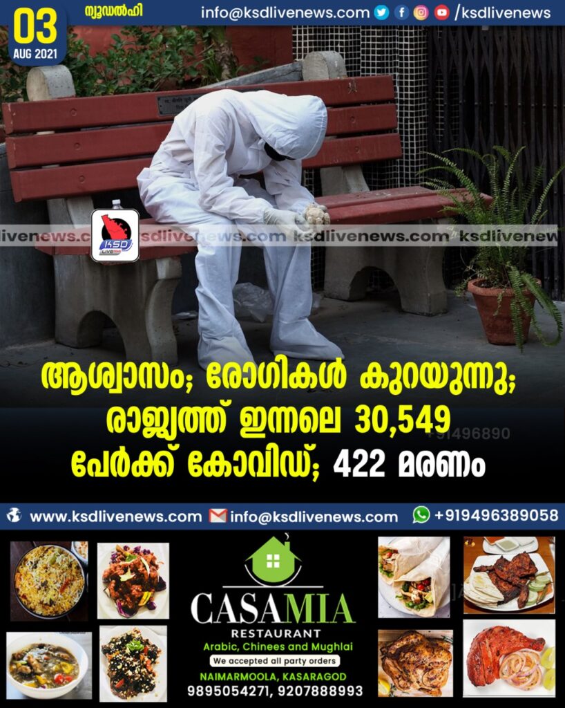 ആശ്വാസം; രോഗികൾ കുറയുന്നു; രാജ്യത്ത് ഇന്നലെ 30,549 പേർക്ക് കോവിഡ്; 422 മരണം