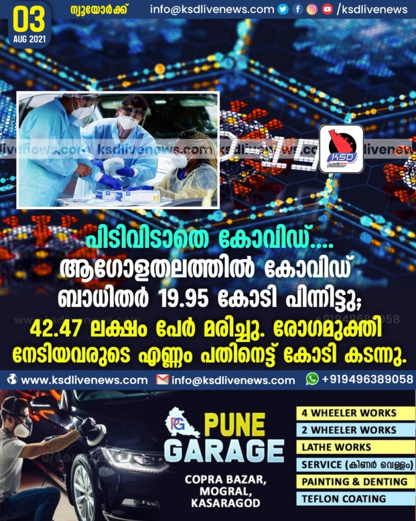 പിടിവിടാതെ കോവിഡ്… ആഗോളതലത്തിൽ കോവിഡ് ബാധിതർ 19.95 കോടി പിന്നിട്ടു; 42.47 ലക്ഷം പേർ മരിച്ചു . രോഗമുക്തി നേടിയവരുടെ എണ്ണം പതിനെട്ട് കോടി കടന്നു.