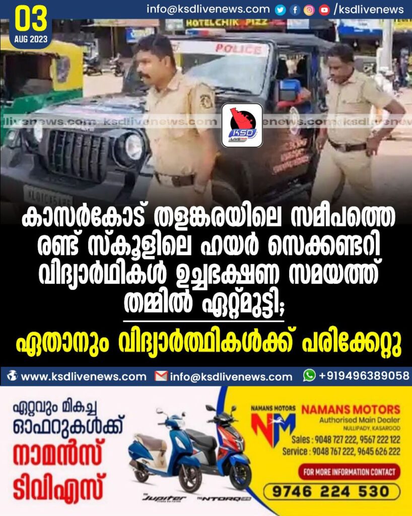 കാസർകോട് തളങ്കരയിലെ സമീപത്തെ രണ്ട് സ്കൂളിലെ ഹയർ സെക്കണ്ടറി വിദ്യാർഥികൾ ഉച്ചഭക്ഷണ സമയത്ത് തമ്മിൽ ഏറ്റ്മുട്ടി; ഏതാനും വിദ്യാർത്ഥികൾക്ക് പരിക്കേറ്റു