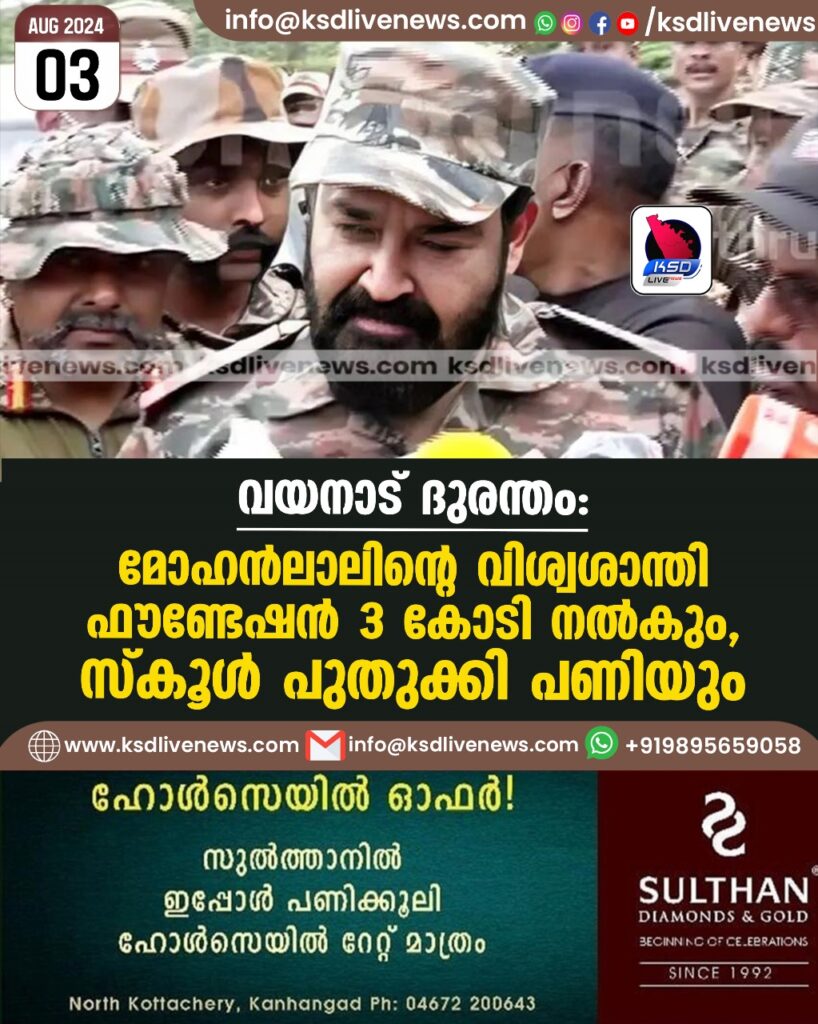 വയനാട് ദുരന്തം: മോഹന്ലാലിന്റെ വിശ്വശാന്തി ഫൗണ്ടേഷന് 3 കോടി നല്കും, സ്കൂള് പുതുക്കി പണിയും