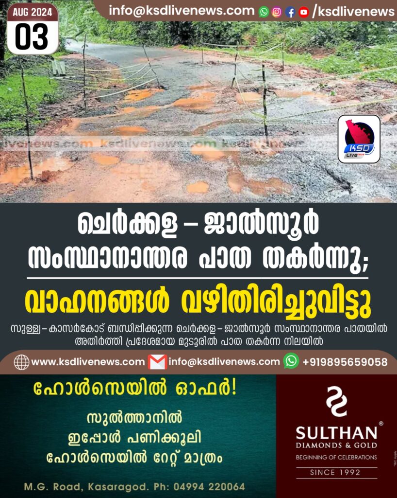 ചെർക്കള-ജാൽസൂർ സംസ്ഥാനാന്തര പാത തകർന്നു; വാഹനങ്ങൾ വഴിതിരിച്ചുവിട്ടു