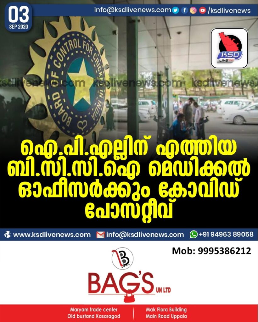 കൊറോണ വൈറസ് ബാധ സ്ഥിരീകരിച്ച ബി.സി.സി.ഐ മെഡിക്കല്‍ ഓഫീസര്‍ക്ക് ലക്ഷണങ്ങള്‍ ഒന്നും ഇല്ലെങ്കിലും ക്വറ്റന്റൈനില്‍ ആകിയിട്ടുണ്ട്. സെപ്റ്റംബര്‍ 19 മുതല്‍ യു.എ.ഇയിലെ മൂന്ന് വേദികളിലായാണ് ഇത്തവണ ഇന്ത്യന്‍ പ്രീമിയര്‍ ലീഗ് നടക്കുന്നത്. ടീമുകള്‍ യു.എ.ഇയിലെത്തി പരിശീലനം ആരംഭിച്ചെങ്കിലും ബി.സി.സി.ഐ ഇതുവരെ മത്സരത്തിന്റെ ഫിക്സ്ചറുകള്‍ പുറത്തുവിട്ടിട്ടില്ല.