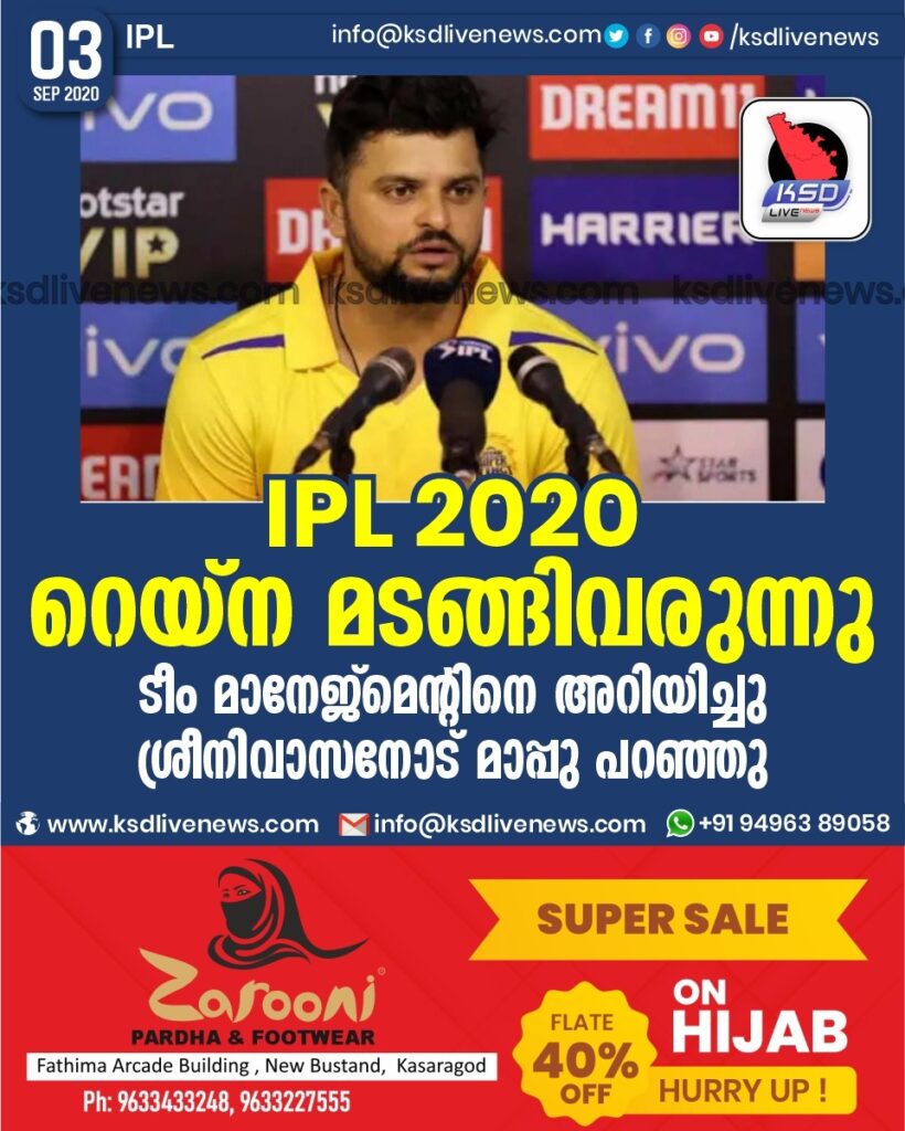 IPL 2020 : റെയ്ന മടങ്ങിവരുന്നു ! ടീം മാനേജ്മെന്റിനെ അറിയിച്ചു , ശ്രീനിവാസനോട് മാപ്പു പറഞ്ഞു