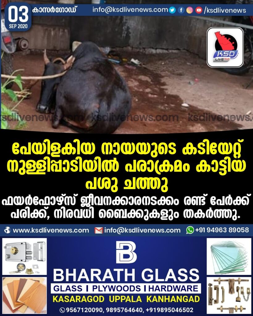 കാസര്‍കോട്: നുള്ളിപ്പാടിയില്‍ പേയിളകിയ നായയുടെ കടിയേറ്റ് പശുവിനും പേയിളകി; പേയിളകിയ പശു പരാക്രമം കാട്ടിയത് നാട്ടുകാരെ പരിഭ്രാന്തിയിലാഴ്ത്തി. ഇന്നലെ ഉച്ചയോടെയാണ് സംഭവം. പശുവിന്റെ പരാക്രമത്തില്‍ ഏതാനും ഇരുചക്രവാഹനങ്ങള്‍ക്ക് കേടുപാടുണ്ടായി. പശുവിനെ തളക്കാന്‍ ശ്രമിക്കുന്നതിനിടെ ഫയര്‍ഫോഴ്‌സ് ജീവനക്കാരനും പ്രദേശത്തെ ഒരു യുവാവിനും പരിക്കേറ്റു. ഫയര്‍ഫോഴ്‌സെത്തി ഏറെ പരിശ്രമിച്ചാണ് പശുവിനെ വലയിട്ട് കീഴ്‌പ്പെടുത്തിയത്. തുടര്‍ന്ന് സമീപത്തെ പറമ്പില്‍ കെട്ടിയിട്ടു. രാത്രിയോടെ മൃഗഡോക്ടറെത്തി കുത്തിവെപ്പ് നടത്തി. അതേസമയം പശുവിനെ ഇന്ന് രാവിലെ ചത്ത നിലയില്‍ കണ്ടെത്തി.കഴിഞ്ഞ ദിവസം നഗര പരിധിയില്‍ പരാക്രമം കാട്ടിയ പേയിളകിയ നായ കടിച്ചതുമൂലമാണ് പശുവിന് പേയിളകിയതെന്ന് കരുതുന്നു. മറ്റൊരു പശുവിനെയും നായ കടിച്ചതായി സൂചനയുണ്ട്. നായയുടെ കടിയേറ്റ് അമ്പതിലേറെ പേര്‍ കാസര്‍കോട് ജനറല്‍ ആസ്പത്രിയില്‍ ചികിത്സ തേടിയിരുന്നു. അതിനിടെയാണ് പേയിളകിയ പശുവും പരാക്രമം കാട്ടിയത്. ഇതോടെ മണിക്കൂറുകളോളമാണ് നാട്ടുകാര്‍ ഭീതിയിലായത്.