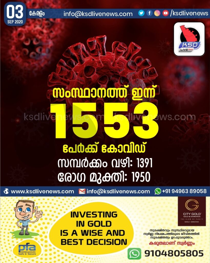 സംസ്ഥാനത്ത് ഇന്ന് 1553 പേർക്ക് കോവിഡ് സ്ഥിരീകരിച്ചു. സമ്പർക്കം വഴി 1391 പേർക്കും.രോഗ മുക്തി 1950 പേർക്കും. മരണം 10