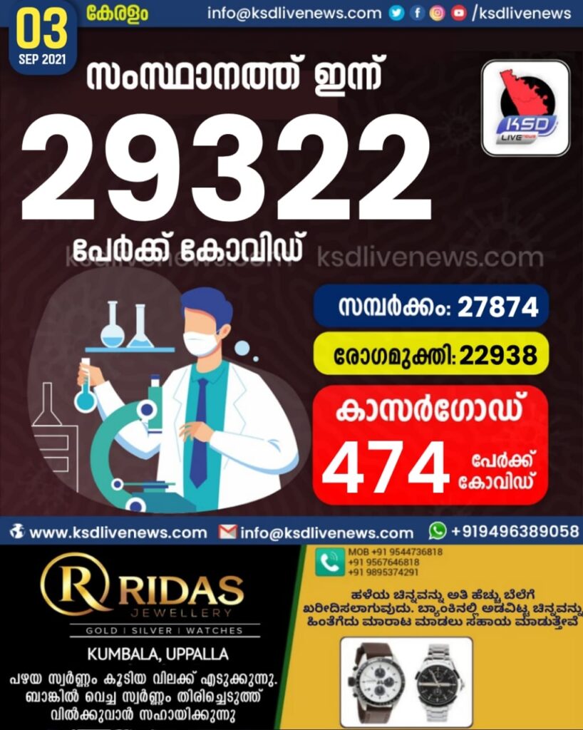 സംസ്ഥാനത്ത് ഇന്ന് 29322 പേർക്ക് കോവിഡ് സ്ഥിരീകരിച്ചു. സമ്പർക്കം വഴി 27874 പേർക്കും ; ആശ്വാസമായി 22938 പേർക്ക് രോഗ മുക്തിയും ; കാസർഗോഡ് ജില്ലയിൽ 474 പേർക്ക് പുതിയ കോവിഡ് കേസുകൾ ; മരണം 131