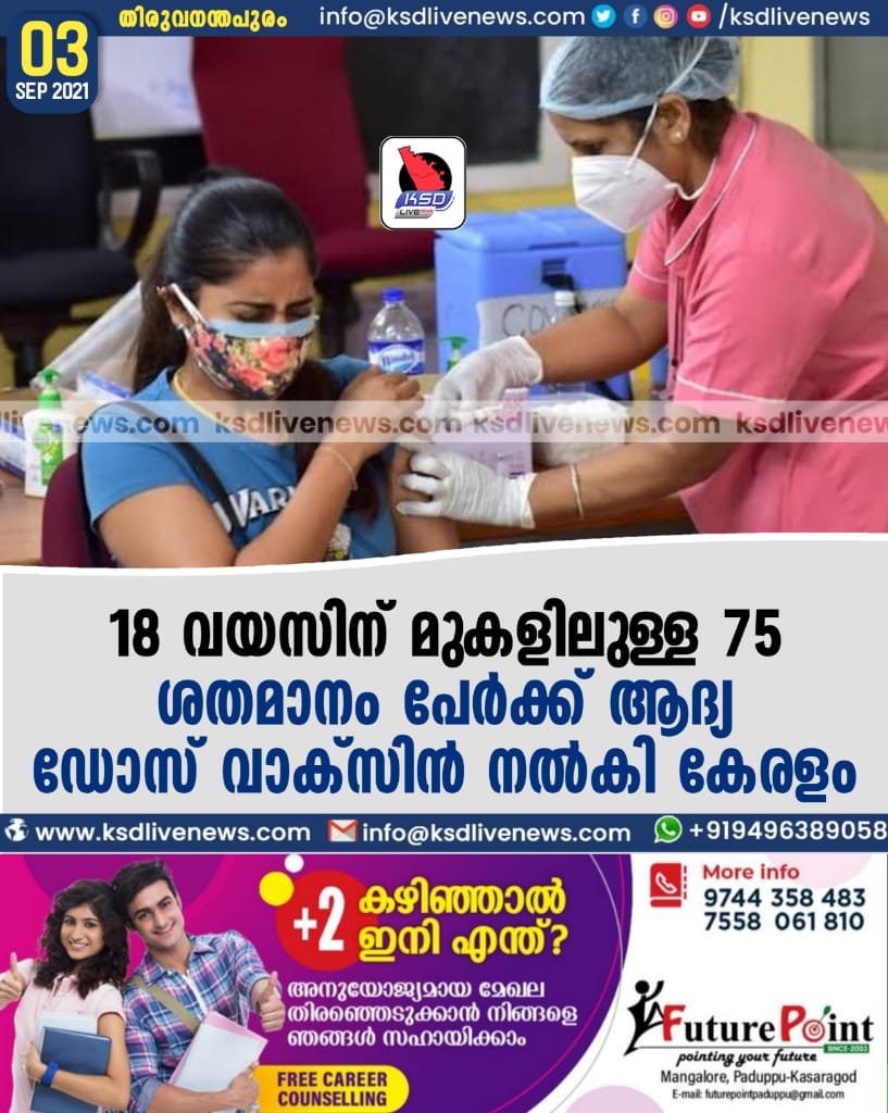 18 വയസിന് മുകളിലുള്ള 75 ശതമാനം പേർക്ക് ആദ്യ ഡോസ് വാക്സിന് നല്കി കേരളം