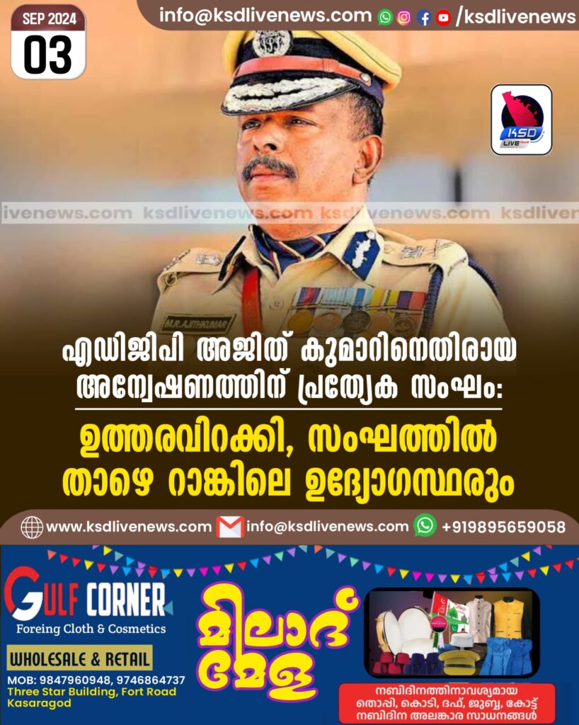 എഡിജിപി അജിത് കുമാറിനെതിരായ അന്വേഷണത്തിന് പ്രത്യേക സംഘം, ഉത്തരവിറക്കി, സംഘത്തില് താഴെ റാങ്കിലെ ഉദ്യോഗസ്ഥരും