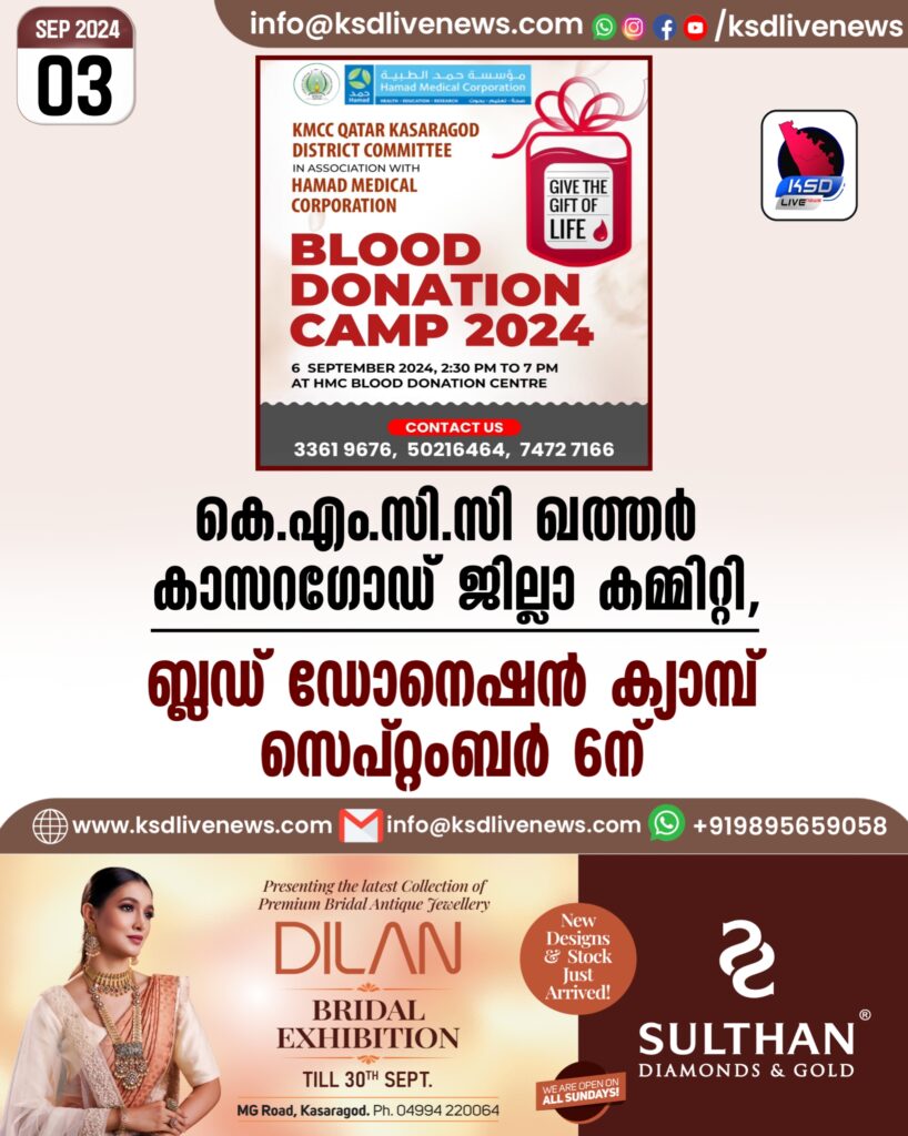 കെ.എം.സി.സി ഖത്തർ കാസറഗോഡ് ജില്ലാ കമ്മിറ്റി, ബ്ലഡ് ഡോനെഷൻ ക്യാമ്പ് സെപ്റ്റംബർ 6ന്