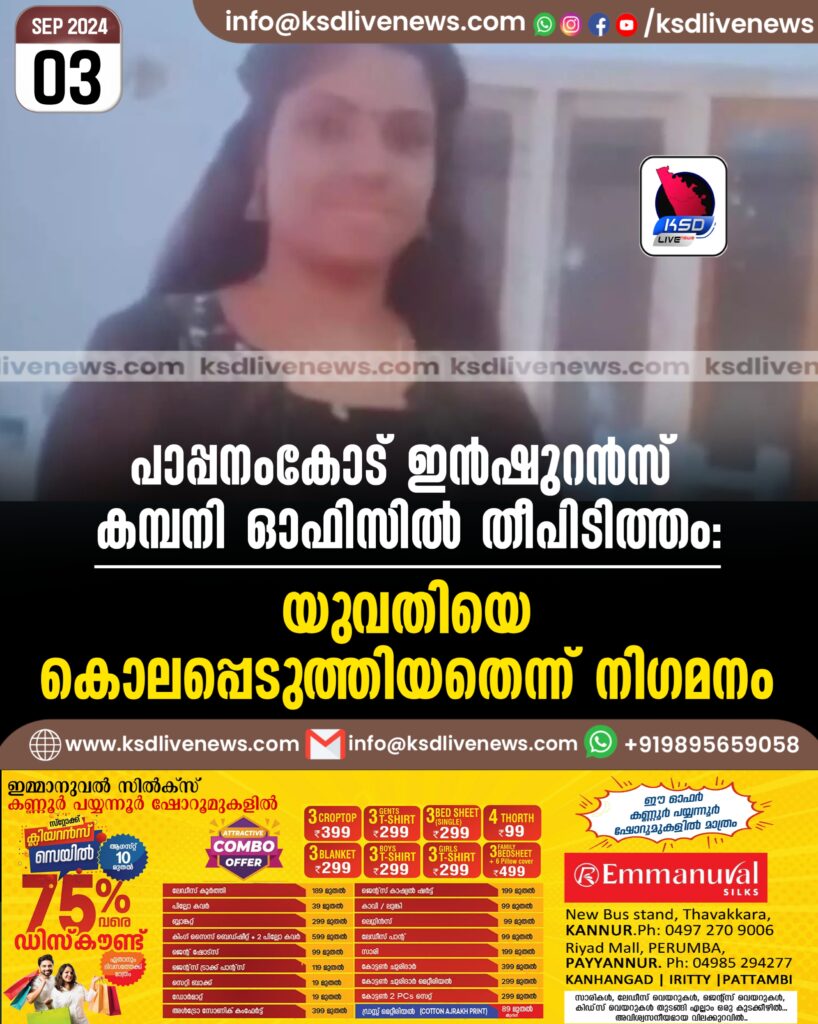 പാപ്പനംകോട് ഇൻഷുറൻസ് കമ്പനി ഓഫിസിൽ തീപിടിത്തം: യുവതിയെ കൊലപ്പെടുത്തിയതെന്ന് നിഗമനം