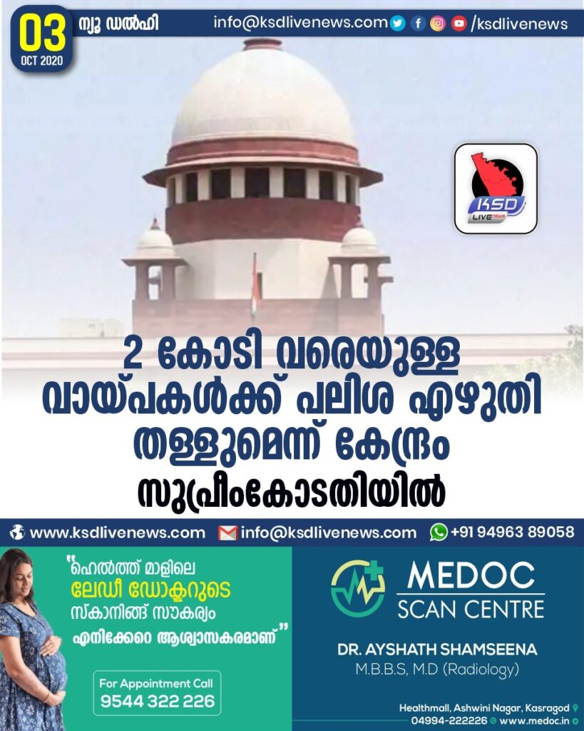 2 കോടി വരെയുള്ള വായ്പകൾക്ക് പലിശ എഴുതി തള്ളുമെന്ന് കേന്ദ്രം സുപ്രീംകോടതിയിൽ