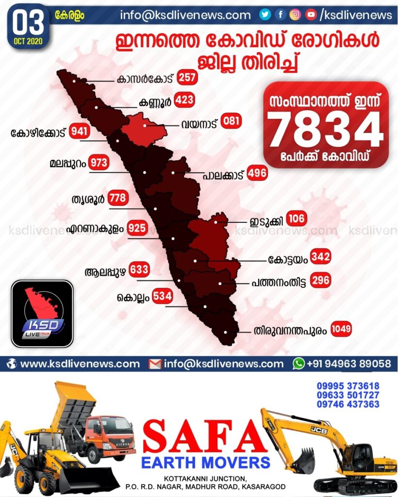സംസ്ഥാനത്ത് ഇന്ന് 7834 പേര്ക്ക് കോവിഡ്-19 സ്ഥിരീകരിച്ചു. തിരുവനന്തപുരം 1049, മലപ്പുറം 973, കോഴിക്കോട് 941, എറണാകുളം 925, തൃശൂര് 778, ആലപ്പുഴ 633, കൊല്ലം 534, പാലക്കാട് 496, കണ്ണൂര് 423, കോട്ടയം 342, പത്തനംതിട്ട 296, കാസര്ഗോഡ് 257, ഇടുക്കി 106, വയനാട് 81 എന്നിങ്ങനേയാണ് ജില്ലകളില് ഇന്ന് രോഗ ബാധ സ്ഥിരീകരിച്ചത്.