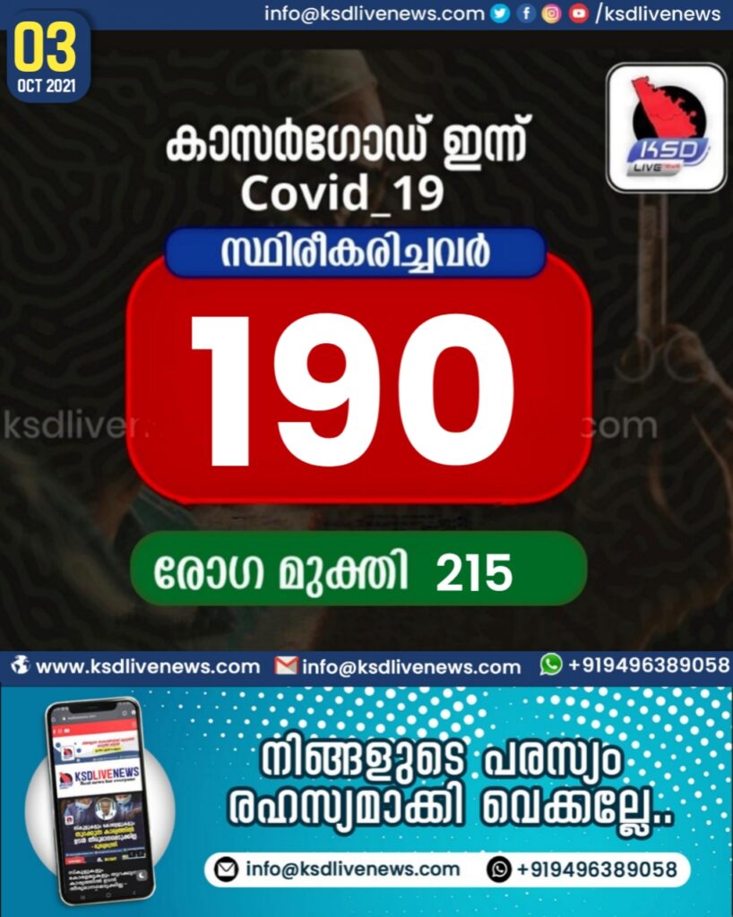 കാസര്കോട് ജില്ലയില 190പേര് കൂടി കോവിഡ് 19 പോസിറ്റീവായി. ചികിത്സയിലുണ്ടായിരുന്ന 221