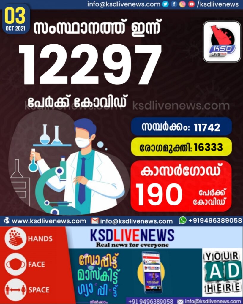 സംസ്ഥാനത്ത് ഇന്ന് 12,297 പേർക്ക് കോവിഡ് സ്ഥിരീകരിച്ചു. സമ്പർക്കം വഴി 11742 പേർക്കും ; ആശ്വാസമായി 16333 പേർക്ക് രോഗ മുക്തിയും ; കാസർഗോഡ് ജില്ലയിൽ 190 പേർക്ക് പുതിയ കോവിഡ് കേസുകൾ ; മരണം 87