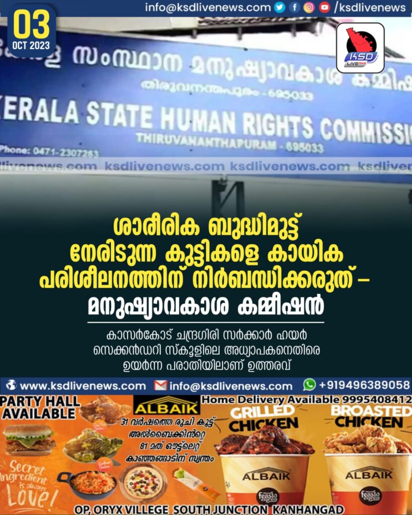 കാസര്കോട്: ശാരീരിക ബുദ്ധിമുട്ട് നേരിടുന്ന കുട്ടികളെ കായിക പരിശീലനത്തില് പങ്കെടുക്കാന് സ്കൂള് പ്രധാന അധ്യാപകനോ കായിക അധ്യാപകനോ നിര്ബന്ധിക്കരുതെന്ന് മനുഷ്യാവകാശ കമ്മീഷന്. ആര്ത്തവ സംബന്ധമായ ശാരീരിക ബുധിമുട്ടുകള് നേരിടുന്ന പെണ്കുട്ടി പിടി പിരീയഡില് കളിസ്ഥലത്തേക്ക് പോകാതെ ക്ലാസ് മുറിയില് ഇരുന്നതിന് അധ്യാപകന് ശാസിച്ചതു പൊലുള്ള സംഭവങ്ങള് ആവര്ത്തിക്കരുതെന്നും ആക്ടിങ് ചെയര്പേഴ്സണ് കെ ബൈജുനാഥ് ഉത്തരവില് പറയുന്നു. കാസര്കോട് ചന്ദ്രഗിരി സര്ക്കാര് ഹയര് സെക്കന്ഡറി സ്കൂളിലെ അധ്യാപകനെതിരെ ഉയര്ന്ന പരാതിയിലാണ് ഉത്തരവ്