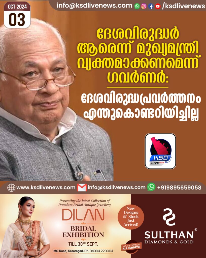 3 വർഷമായി ദേശവിരുദ്ധ പ്രവർത്തനങ്ങൾ നടക്കുന്നുവെന്ന് മുഖ്യമന്ത്രി തന്നെ പറഞ്ഞു. അത് എന്താണെന്നറിയാൻ ഓരോ ഇന്ത്യക്കാരനും അവകാശമുണ്ടെന്നും ഗവർണർ പറഞ്ഞു. മുഖ്യമന്ത്രിയുടെ മലപ്പുറം പരാമര്ശത്തിലും ഗവര്ണര് വിശദീകരണം തേടിയിട്ടുണ്ട്. ശ്രദ്ധയില്പെട്ട ദേശവിരുദ്ധ പ്രവര്ത്തനങ്ങളുടെ വിവരങ്ങള് ഉടന് അറിയിക്കണമെന്നും ഗവര്ണര് ആവശ്യപ്പെട്ടു.