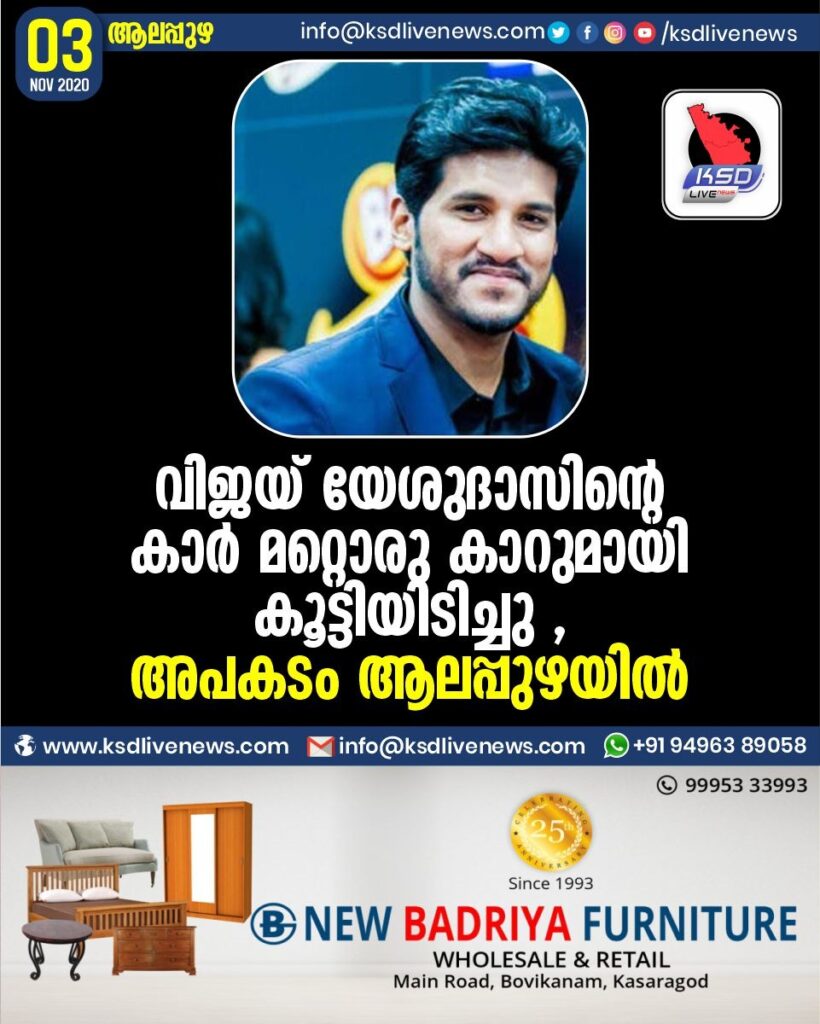 വിജയ് യേശുദാസിന്റെ കാർ മറ്റൊരു കാറുമായി കൂട്ടിയിടിച്ചു , അപകടം ആലപ്പുഴയിൽ