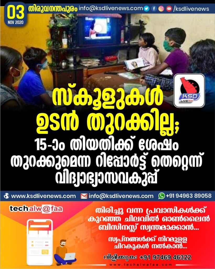സ്കൂളുകൾ ഉടൻ തുറക്കില്ല ; 15 -ാം തിയതിക്ക് ശേഷം തുറക്കുമെന്ന റിപ്പോർട്ട് തെറ്റെന്ന് വിദ്യാഭ്യാസവകുപ്പ്